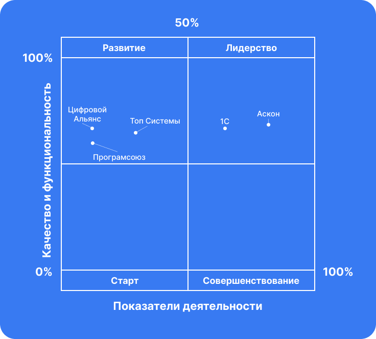 1С. Это крупные отечественные разработчики и поставщики инженерного и делового ПО с долгой успешной историей на рынке. В квадранте